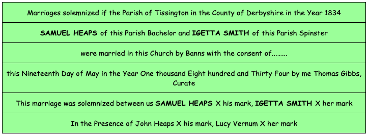 Taking the fact that Hargetter is shown as a widow in the above would lead to looking for a marriage between a Heapes and a Smith. There is a strong possibility of such a marriage in 1834 at Tissington, Derbyshire: