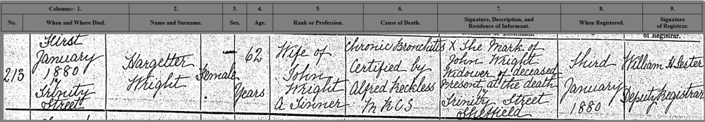 Hargetter Wright dies 1st Jan 1880 at 17 Trinity Street, Sheffield.