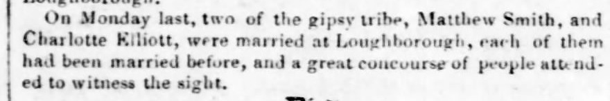 Matthew Smith married Eleanor Smith 5 February 1816 at Loughborough, Leicestershire, register also states “These were Gypsies”
