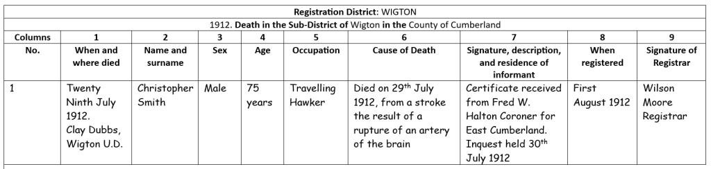 Christopher Smith: Male born 1837: age 75: Death Qtr 3: Year 1912: District Wigton: County Cumberland: Volume 10B: Page 594 Country England:
