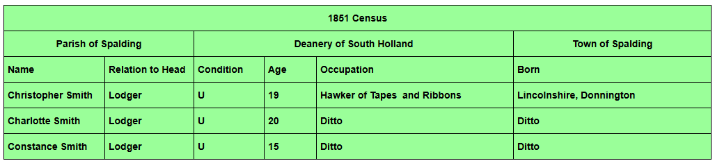 Christopher Smith: Head: Mar: age 46: Occupation Licensed Hawker: Born Yorkshire, West Ardsley