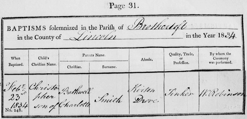 Page 31. No.248: Feby 23rd 1834, Christopher son of Bathwell & Charlotte Smith, abode Kirton Drove, Trade: Tinker, ceremony performed by W. Robinson